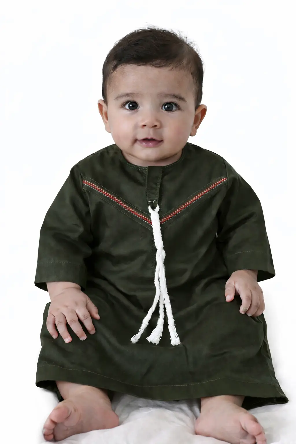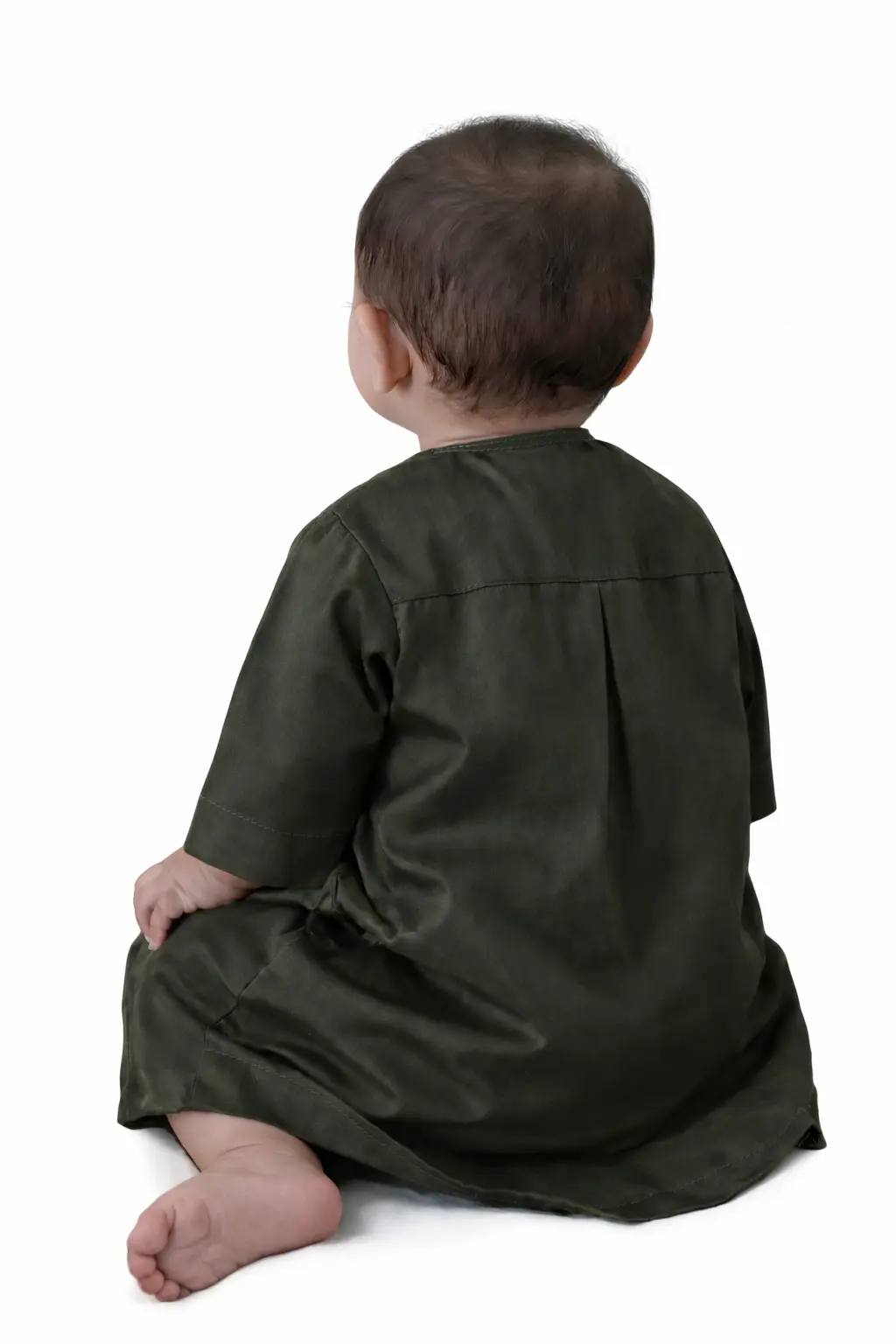 Omani Jubba for Baby Boys & Kids (6 Months – 6 Years) | Premium Cotton Polyester Blend Shiny Fabric | Lightweight Arabic Thobe for Kids | Best for Eid, Ramadan Dark Olive Color