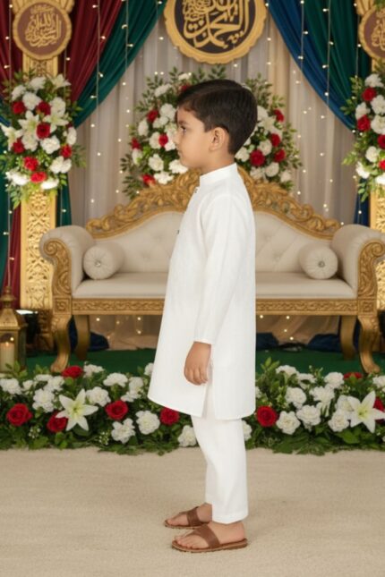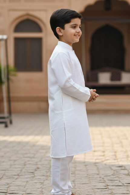 Cotton Boys Kurta Set | Cotton Kids Kurta Pajama | Mandarin Collar, Elastic Pajama | Festive (White)